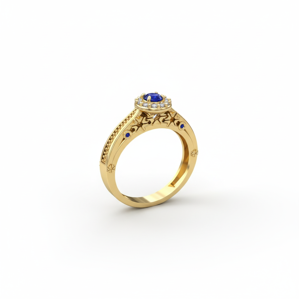 Nas laterais do aro, o anel traz um trabalho vazado artístico que lembra galhos, folhas e ramificações, representando as raízes, o ciclo da vida e o desenvolvimento das plantas – uma homenagem direta ao universo da Agronomia. Pequenas zircônias laterais complementam o brilho da peça, criando pontos de luz sutis quando o anel se movimenta, enquanto os acabamentos delicados na estrutura remetem ao cuidado e à precisão do trabalho no campo e na pesquisa.