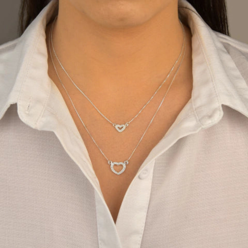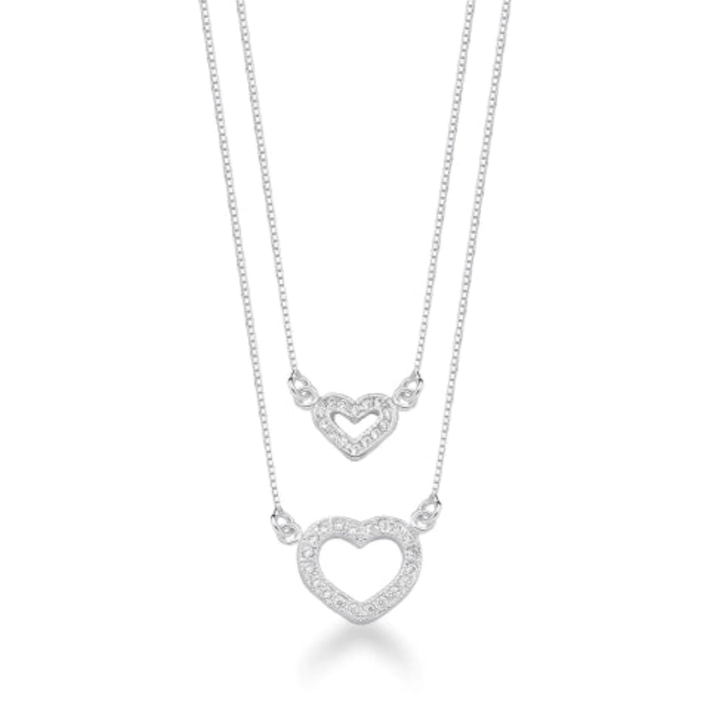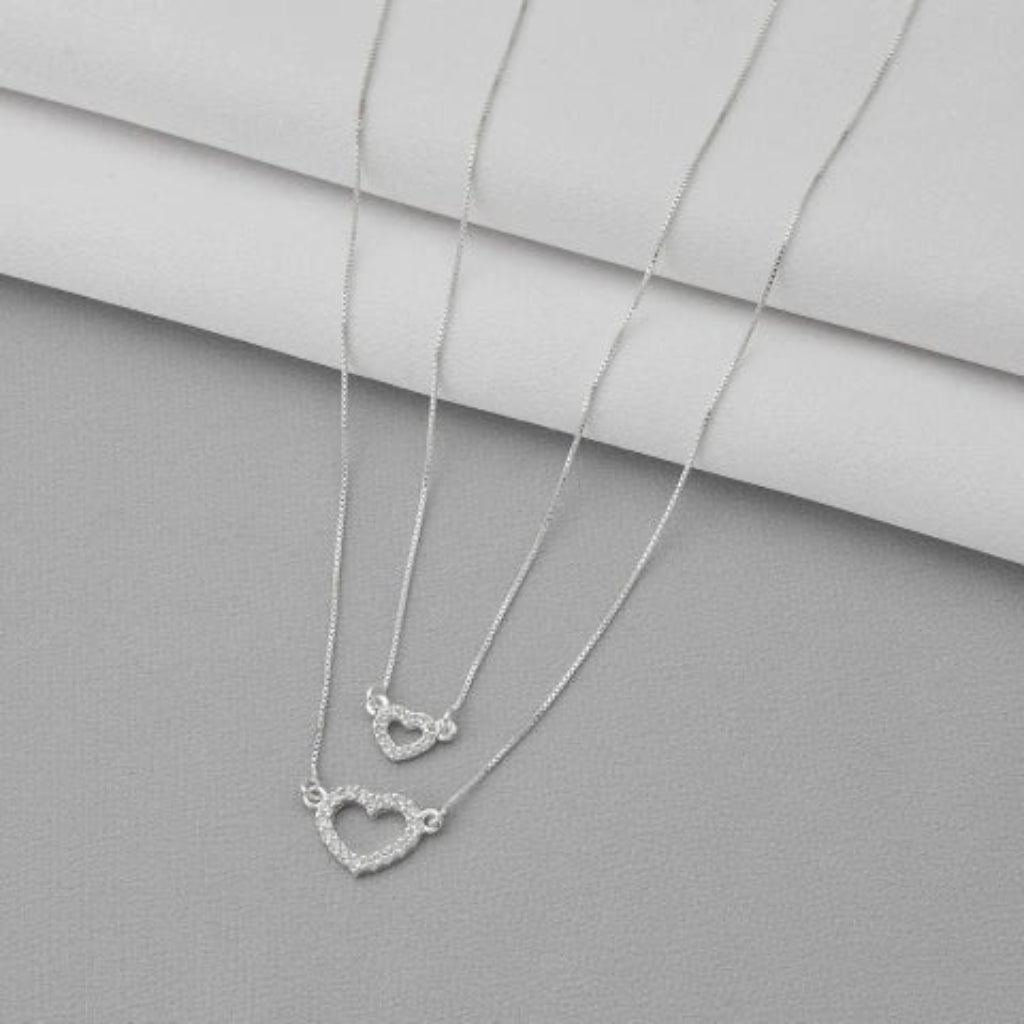 Gargantilha Dupla com Corações Cravejados de Prata 925, esse produto usa corrente de prata veneziana, vem com Pingente Coração pequeno e Pingente Coração Médio, que é os dois são composto por prata cravejada em forma de um coração com espaço vazio;